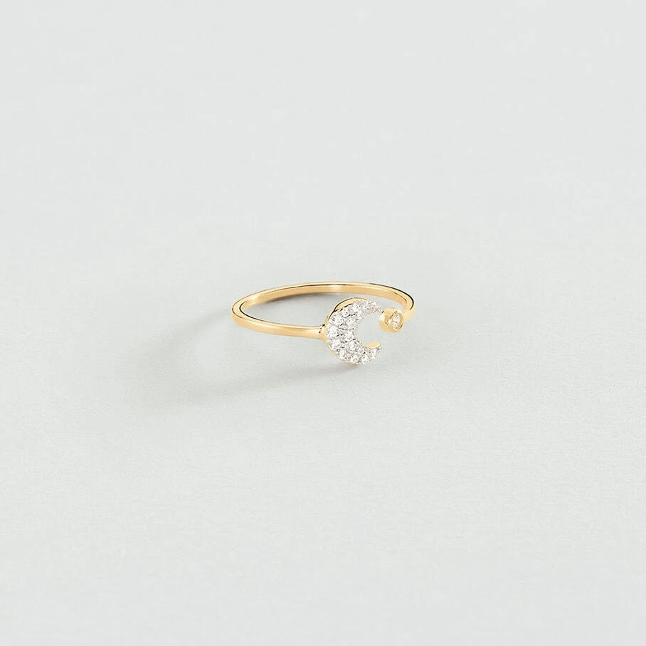 Bague ouverte en toi& moi, en argent véritable et dorée 750/1000, avec une lune pavée et un oxyde de zirconium