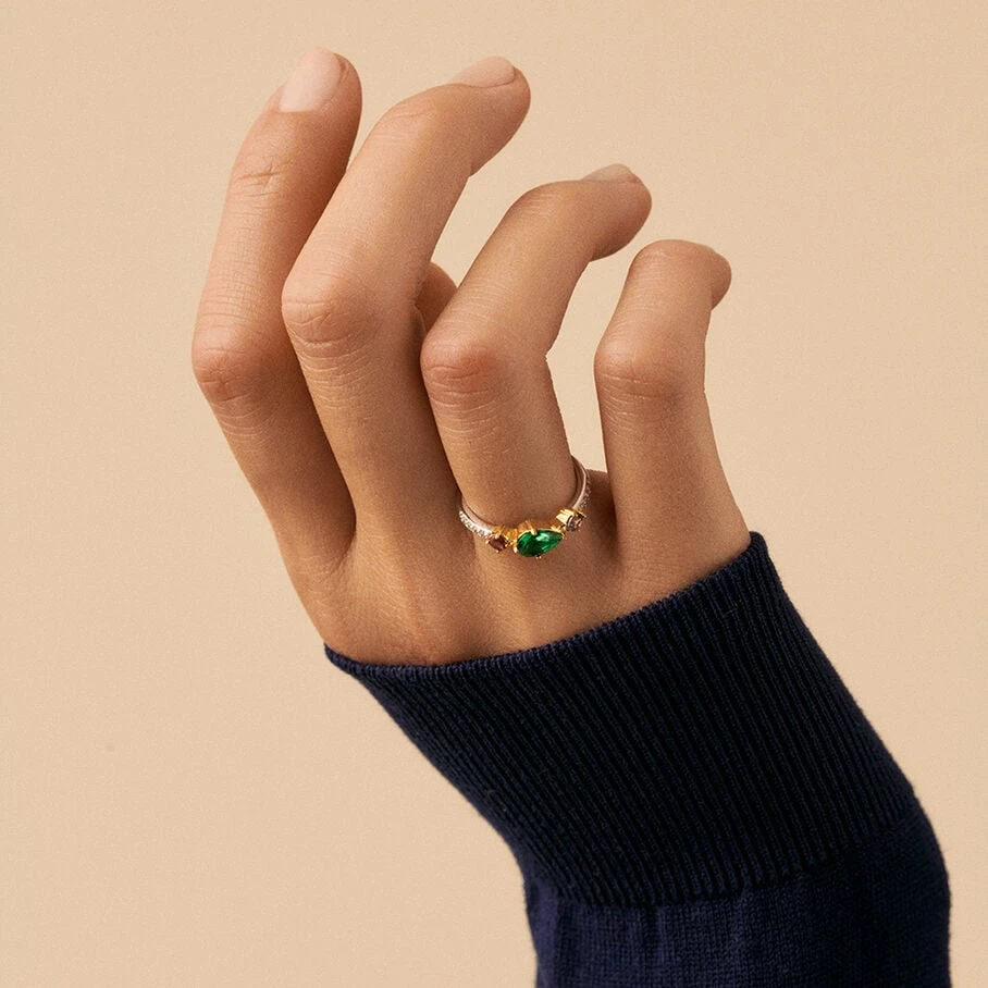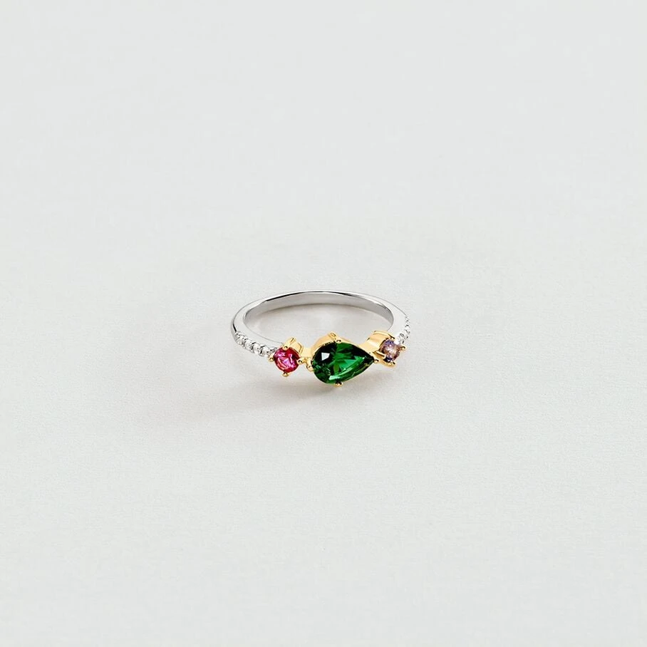 Bague fine pavée, en argent véritable doré 750/1000, sertie d’oxydes de zirconium multicolores, de différentes tailles et formes