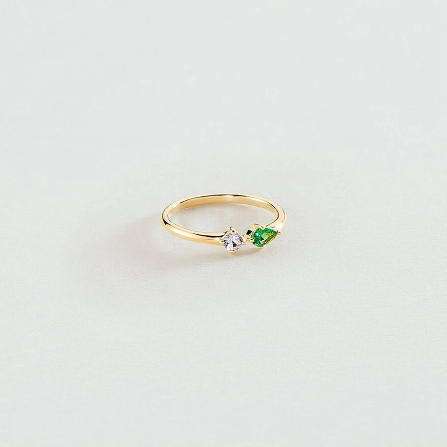 Bague fine, en argent véritable doré 750/1000, sertie de deux oxydes de zirconium de forme goutte et ronde