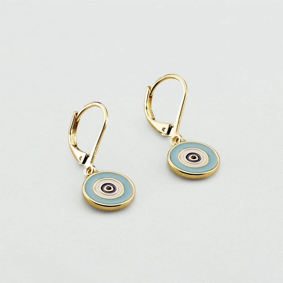 Boucles d’oreilles dormeuses, en laiton doré à l’or fin, avec un œil turc émaillé centré d’un oxyde de zirconium