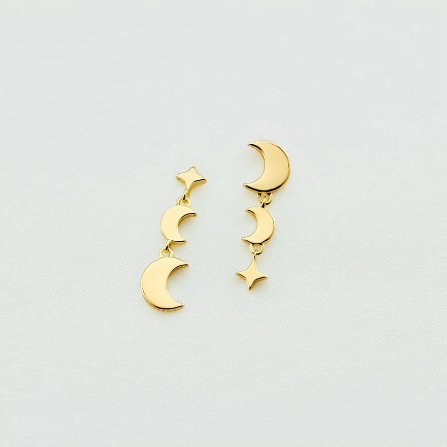 Boucles d’oreilles mi-longues et asymétriques, en argent doré 750/1000, dont les pendentifs représentent le cycle lunaire