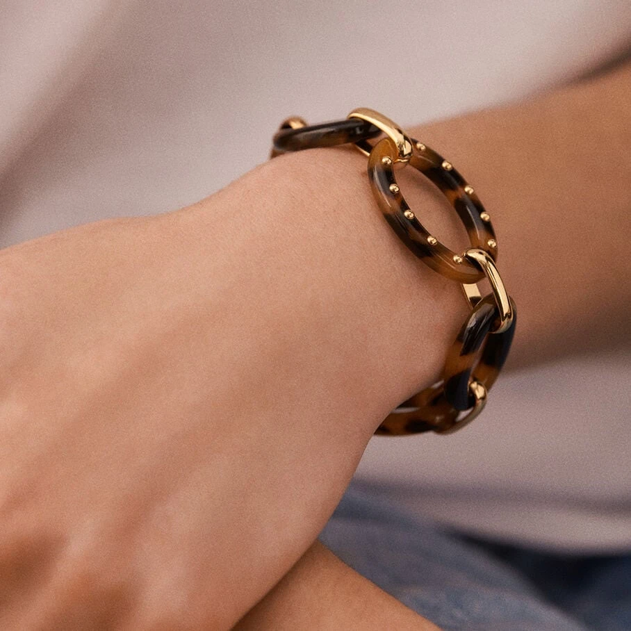 Bracelet en laiton doré 750/1000, avec des maillons ovales en acetate et une boule en métal, fermoir T-bar
