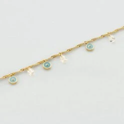 Bracelet, en laiton doré à l’or fin, avec des pampilles d’oeils turcs plats turquoises et des oxydes perçés