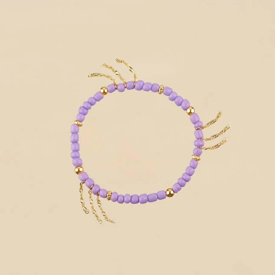 Bracelet elastique, en laiton doré 750/1000, perles de verre enfilées et pompons de chaines