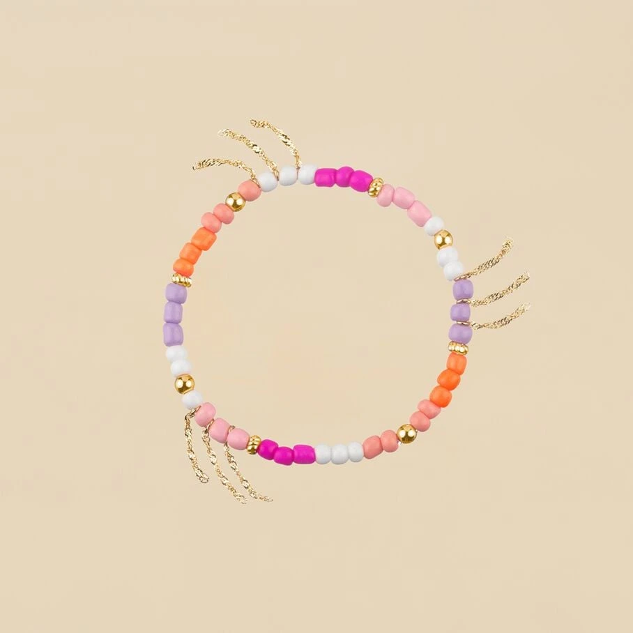 Bracelet elastique, en laiton doré 750/1000, perles de verre enfilées et pompons de chaines