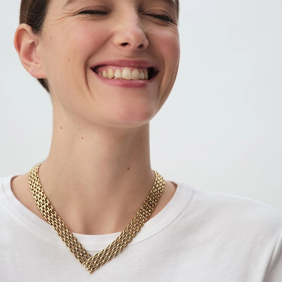 Collier de forme V, en laiton et étain, dont la maille ressemble à une maille de montre