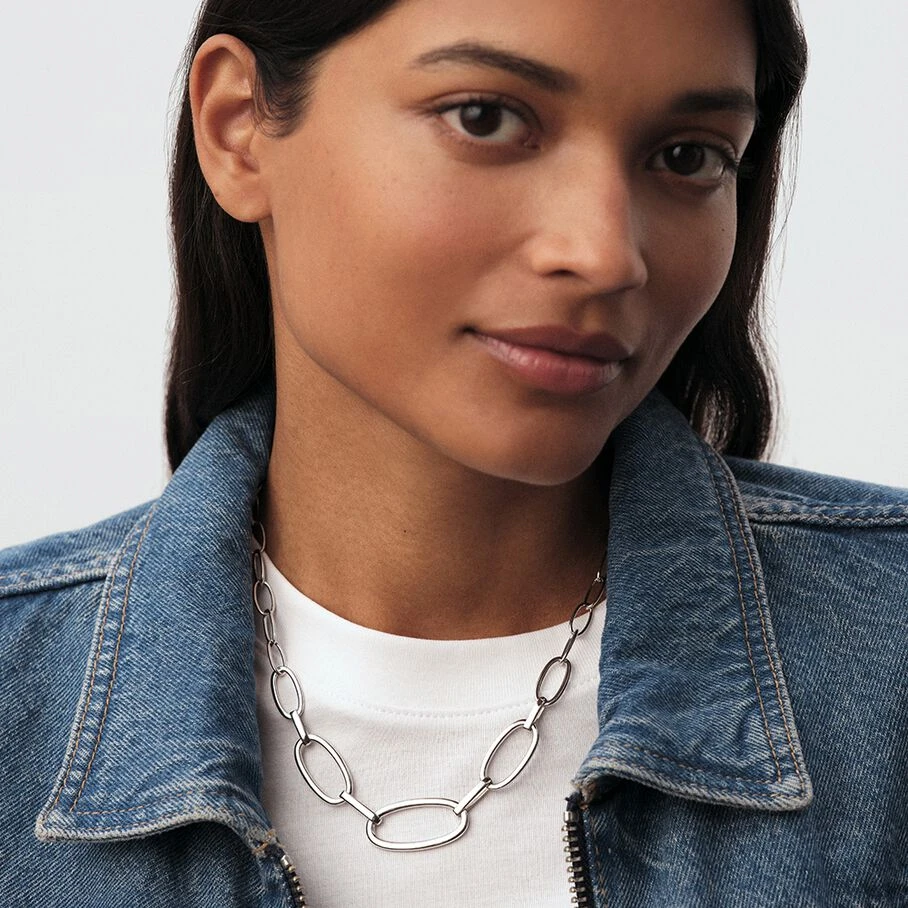Collier maillons ovales allongés de différentes tailles, dégradé sur le devant, et notre fermoir T identitaire