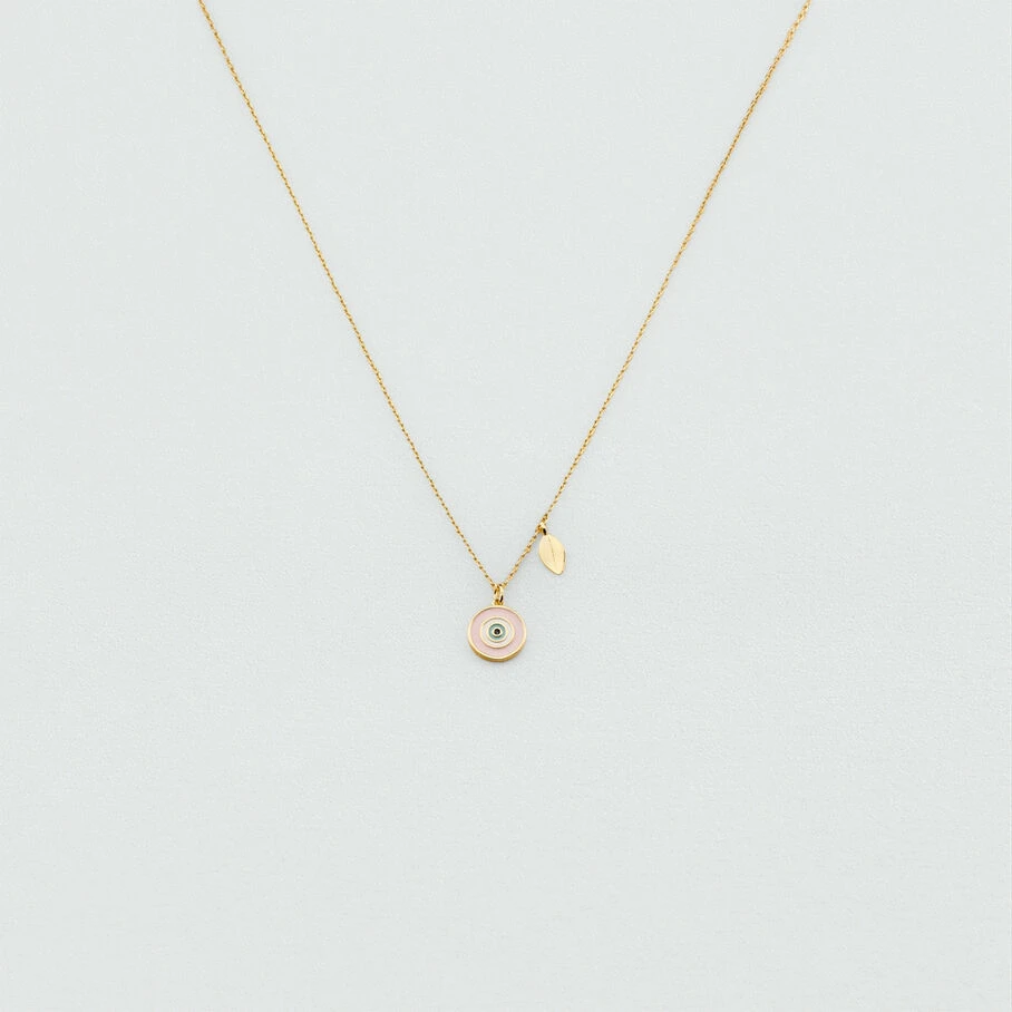 Collier court, en laiton doré à l’or fin, avec un œil turc et un coquillage sur chaine en pendentifs