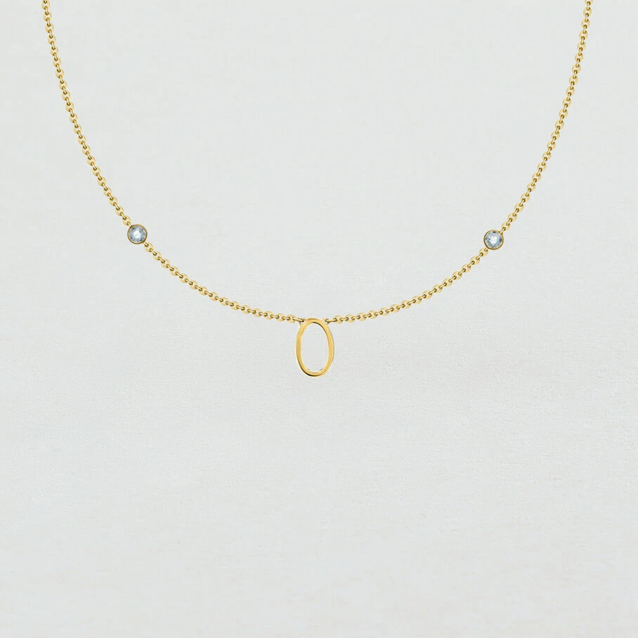 Collier fin composé de la lettre O et de deux oxydes de zirconium. Longueur: 42cm