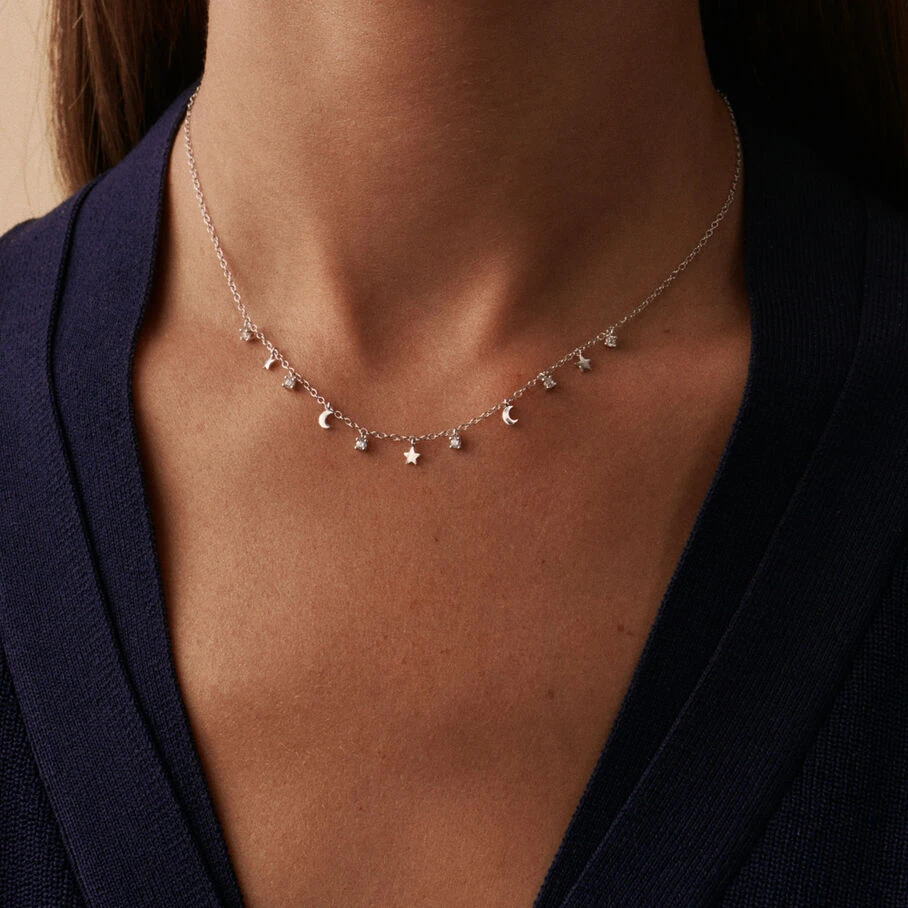 Collier court en argent véritable, multi pampilles lunes, étoiles et oxydes de zirconium griffés