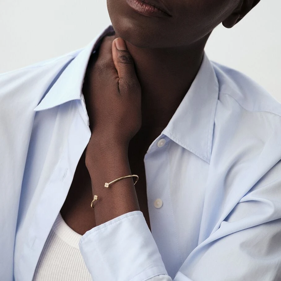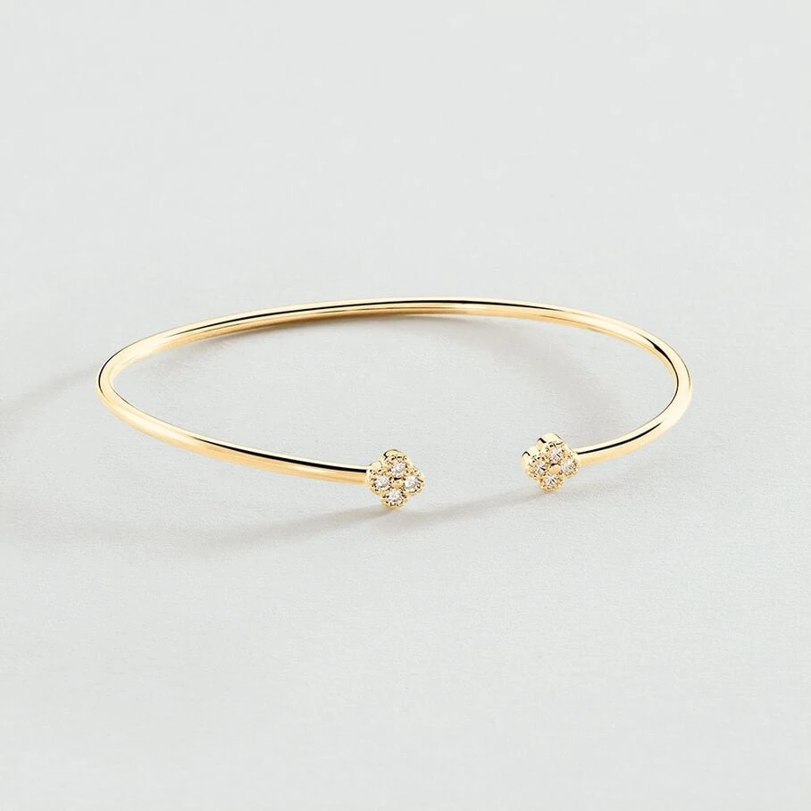 Jonc fin ouvert, en argent véritable doré 750/1000, avec des fleurs d’oxydes de zirconium aux extrémités et un fin graineti sur le pourtour