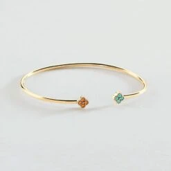 Jonc fin ouvert, en argent véritable doré 750/1000, avec des fleurs d’oxydes de zirconium aux extrémités et un fin graineti sur le pourtour